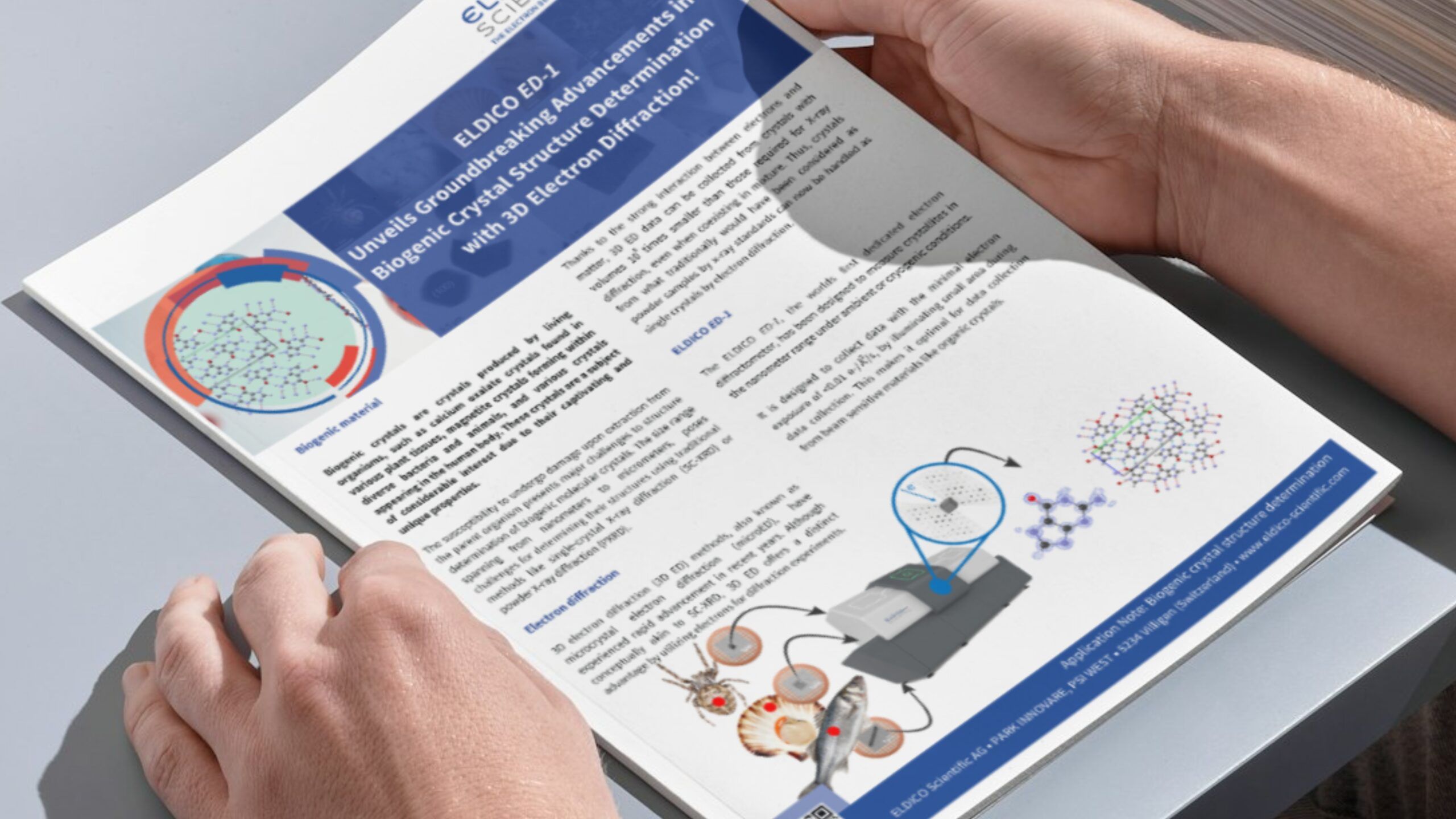 Download our latest application note about Biogenic crystals? Together with scientists from Ben-Gurion University of the Negev, Cardiff University Eldico achieved a significant breakthrough in the structural determination of biogenic crystals from 3D electron diffraction (3D ED) data measured with the ELDICO ED-1. We successfully determined the structure of individual crystals of biogenic guanine directly extracted from spider integument, scallop eyes and fish scales.